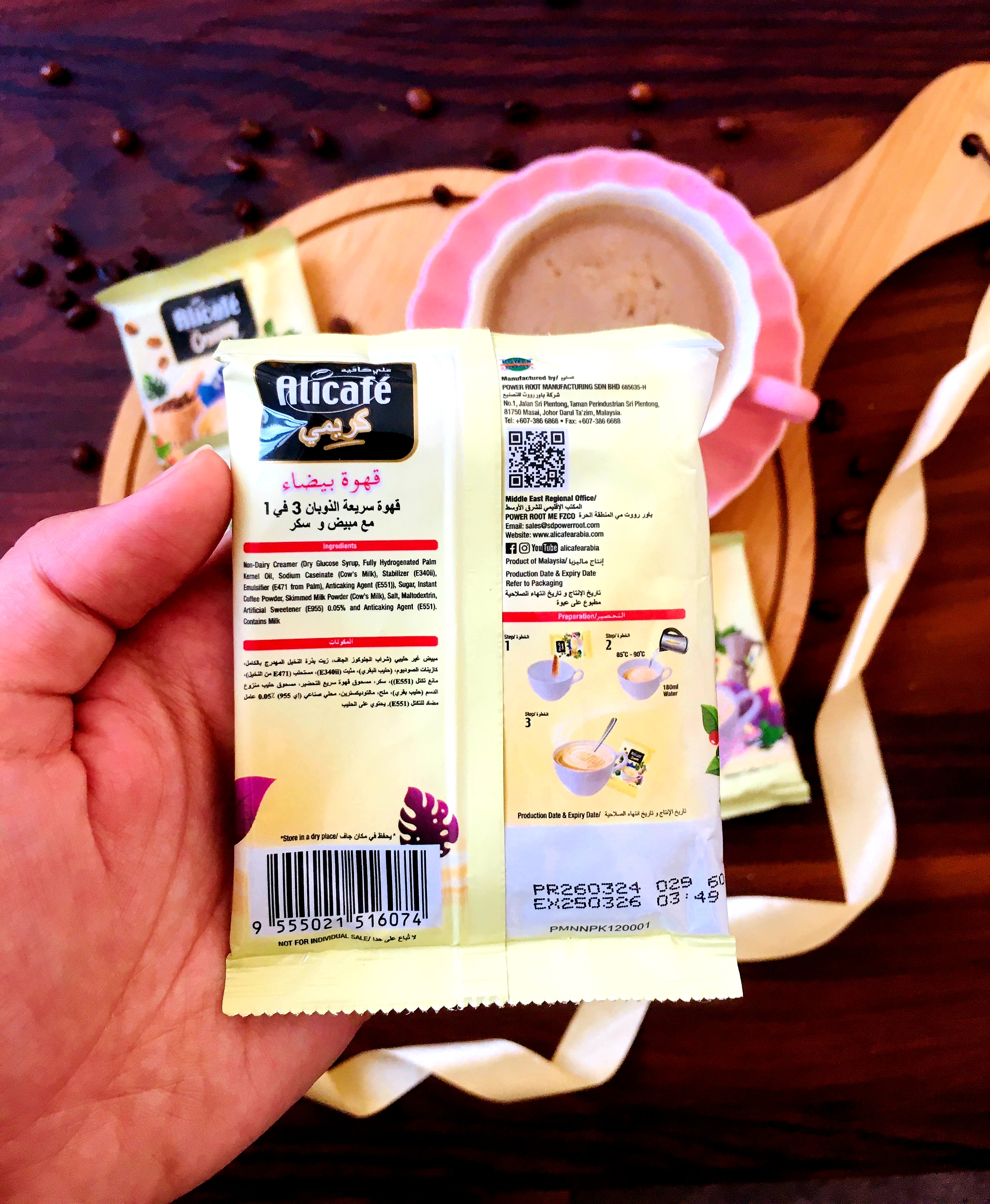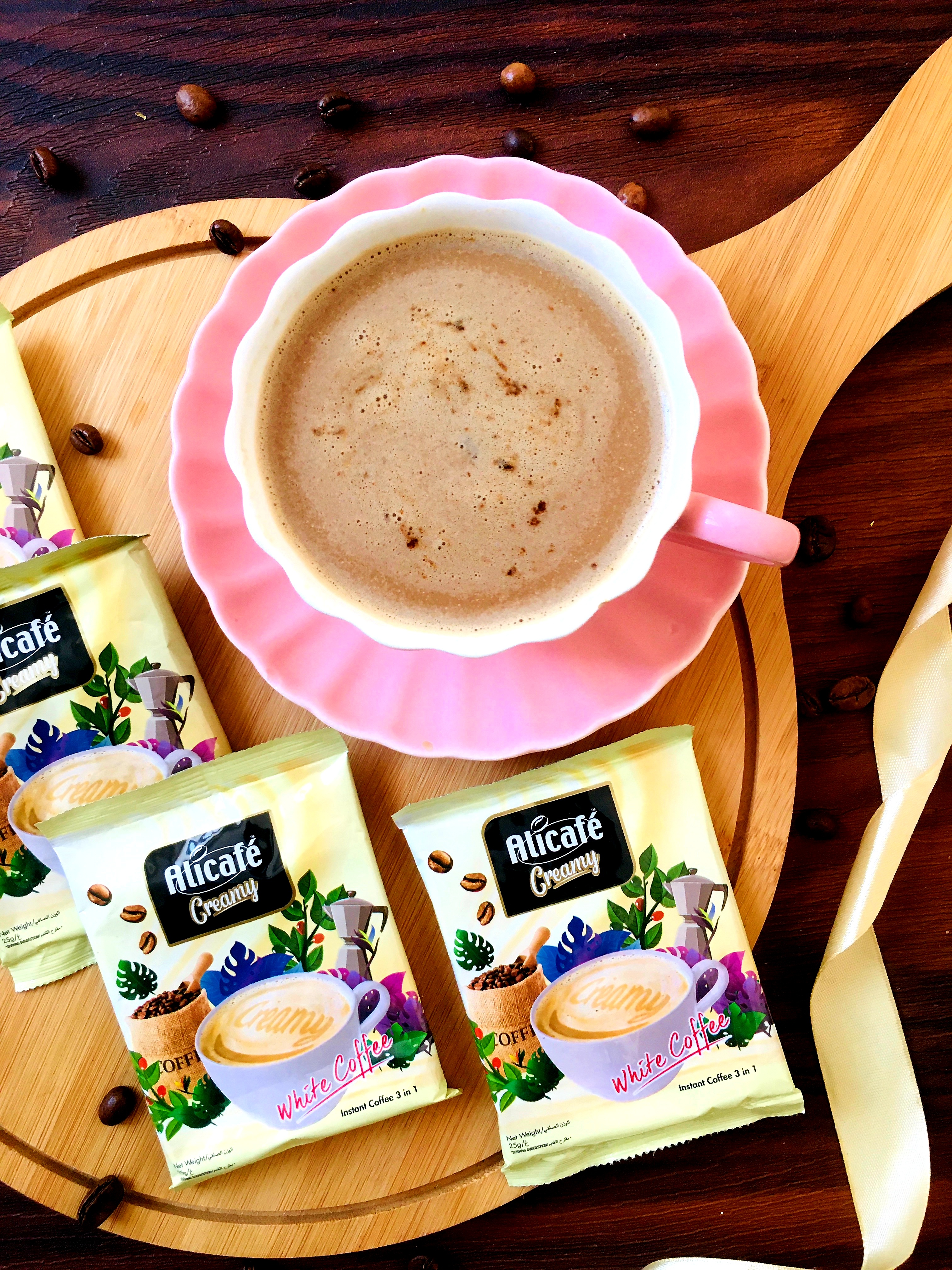 Alicafe 3in1 Creamy White Coffee ترکیبی از قهوه فوری، خامه غیر لبنی و شکر است که طعمی نرم، کرمی و شیرین ایجاد میکند. آماده شدن آن فقط با افزودن آب داغ بسیار سریع و آسان است.